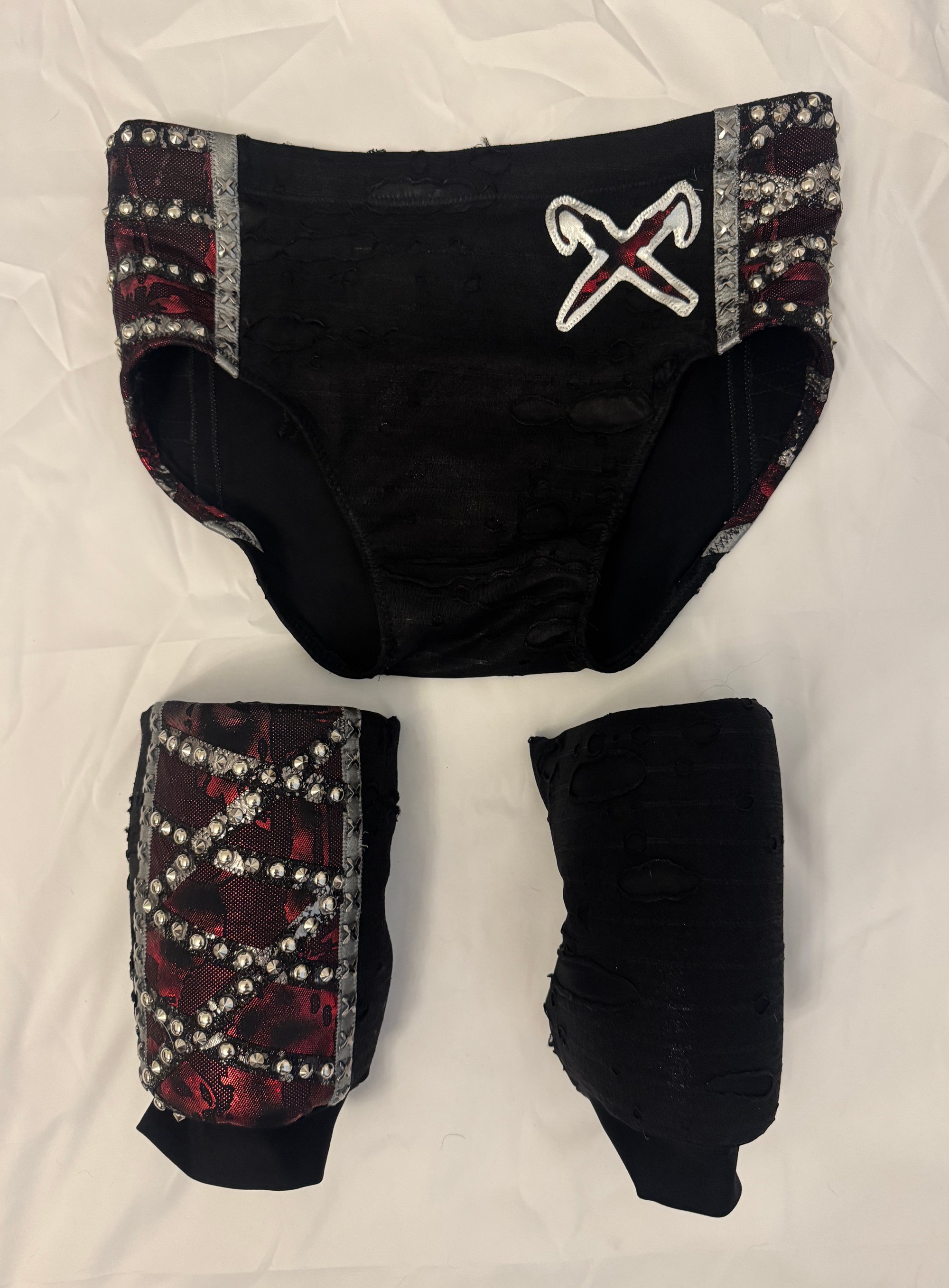 Red/Silver Ring Worn Villain Trunks & Knee Pads